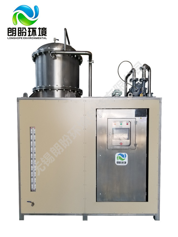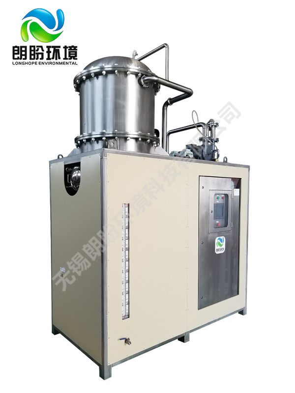熱泵濃縮蒸發器的原理是物料的沸點隨著壓強的降低而降低。低溫節能濃縮設備整體保持真空狀態,濃縮室的真空度約為95%~97%,在此壓強下水的沸點為35℃~37℃,系統無需配備進料泵,利用蒸發室的負壓將物料吸進蒸發室,通過強制循環方式將物料循環霧化,傳輸至換熱器上,物料中水分被蒸發,物料連續循環霧化,通過蒸發室液位自動補料,濃度達到要求后作為濃縮液排出設備。濃縮液一般粘度較大,需采用泵抽出。
